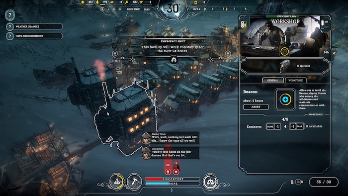 Es ist nicht leicht, ein Gleichgewicht zwischen den Ressourcen für den Generator und der Hoffnung der Menschen zu finden. Es gibt viele erzählerische Momente in diesem Strategiespiel, in denen du die schwierige Entscheidung treffen musst, ob du das tust, was der Stadt zum Überleben verhilft, oder ob du etwas tust, was die Menschen dazu bringt, sich weiterhin um das Überleben zu sorgen. Es ist hart, es ist moralisch herausfordernd, es ist ausgezeichnet.