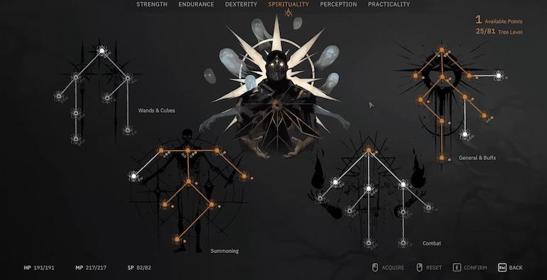 Skill trees are closely tied to build paths, helping you shape your character based on your preferred playstyle. Each build paths unlocks unique abilities, allowing for customisation and synergy. You can also mix skill trees to create hybrid builds, for example, a Spellsword, which blends Strength and Spirituality for melee combat with magical boosts.