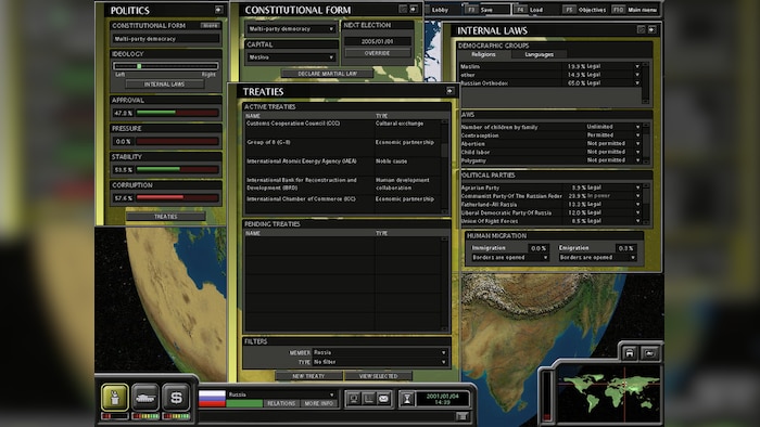 In Superpower 2 you need to deal with domestic and international issues such as elections, budget deficits, civil unrest, and geopolitical tensions. One of the unique features is the ability to negotiate and form alliances with other countries.