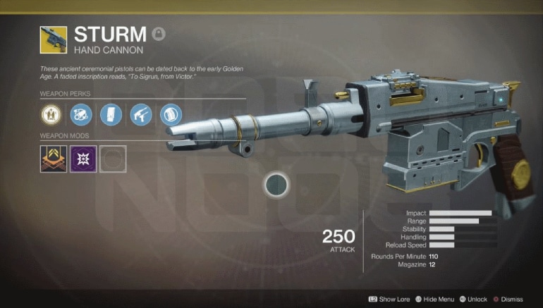 Drang is a Legendary Sidearm for all classes. Obtaining it opens up the way for getting the Sturm, an Exotic Heavy Cannon for the Primary slot. Getting the set is not that easy and will take you at least an hour or so, but it is worth it.