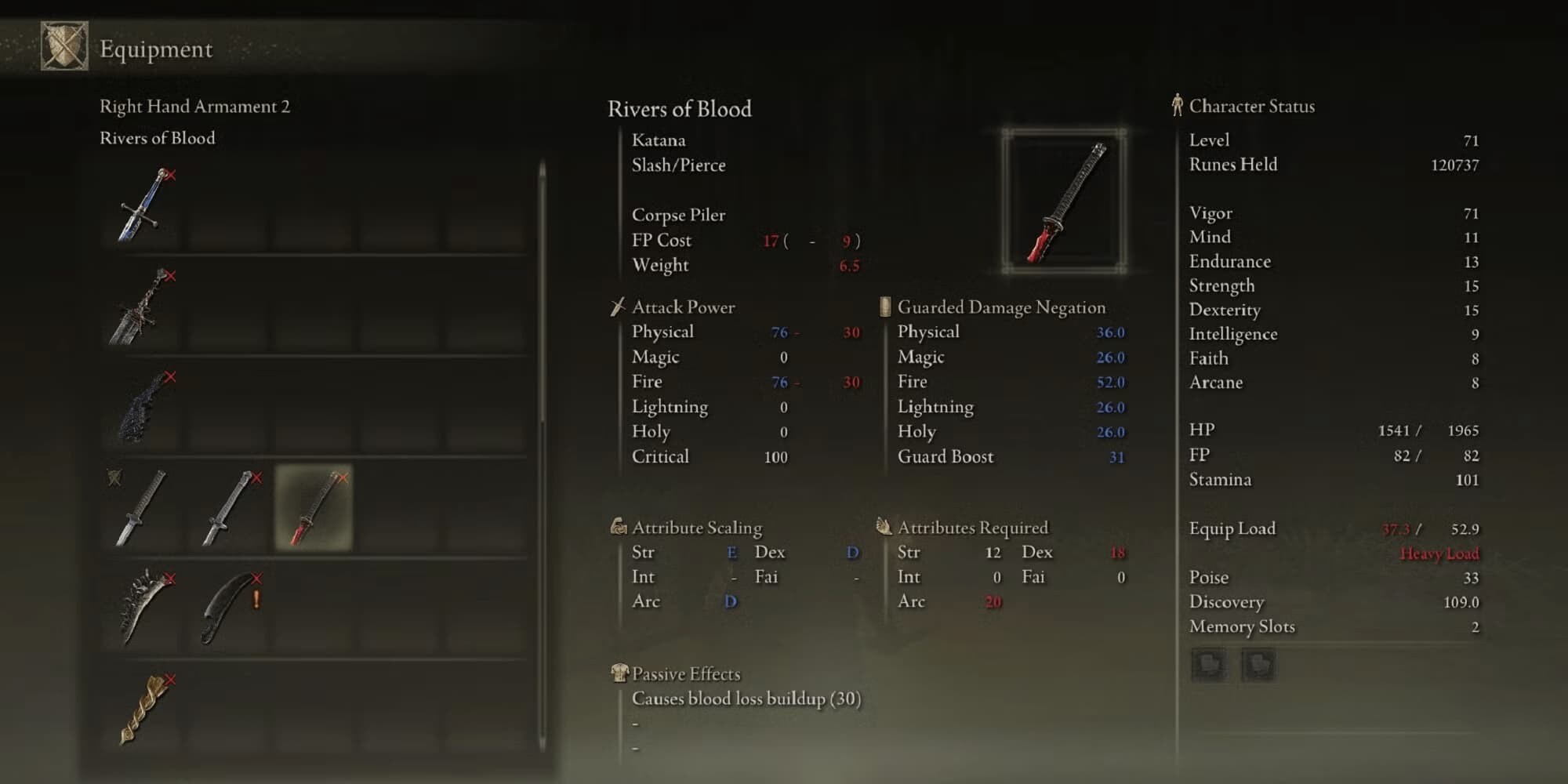 Rivers of Blood is the best bleed build in Elden Ring for many reasons and one of them is stat distribution as well as unique skill design. Attribute requirements for Rivers of Blood are: