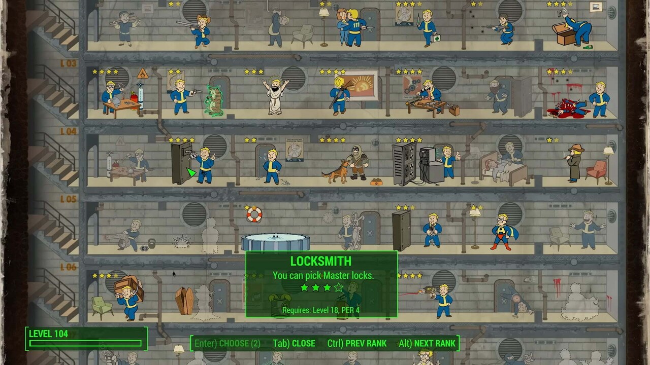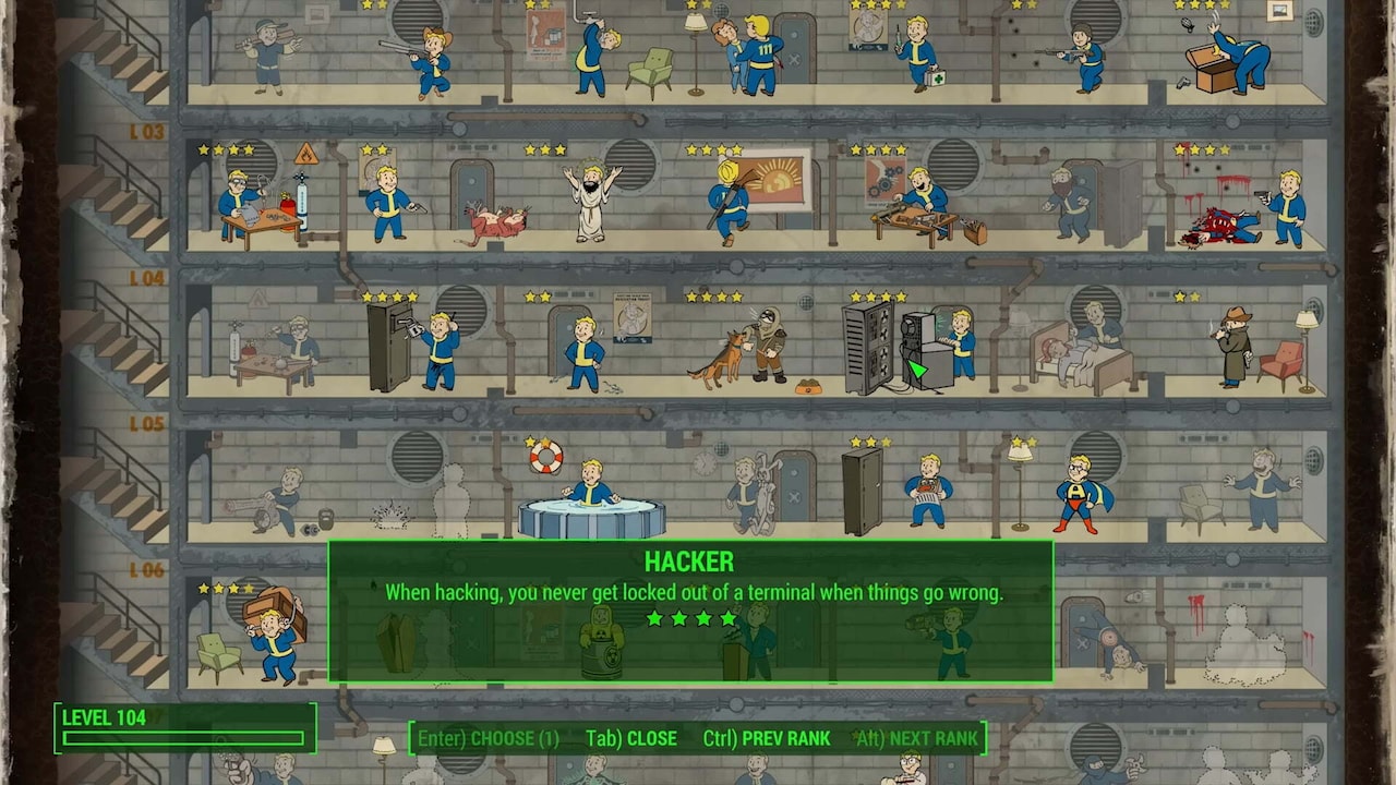 Hacker works similarly to Locksmith, except this one is related to terminals. Just like with Locksmith, the first 3 Ranks of Hacker will allow you to interact with increasingly complex terminals: Advanced, Expert, and Master. Rank 3 is also a reasonable point to stop investing in Hacker; Rank 4 isn’t particularly useful unless you’re so impatient that you can’t wait 10 seconds after a failed hacking attempt to reset the terminal.