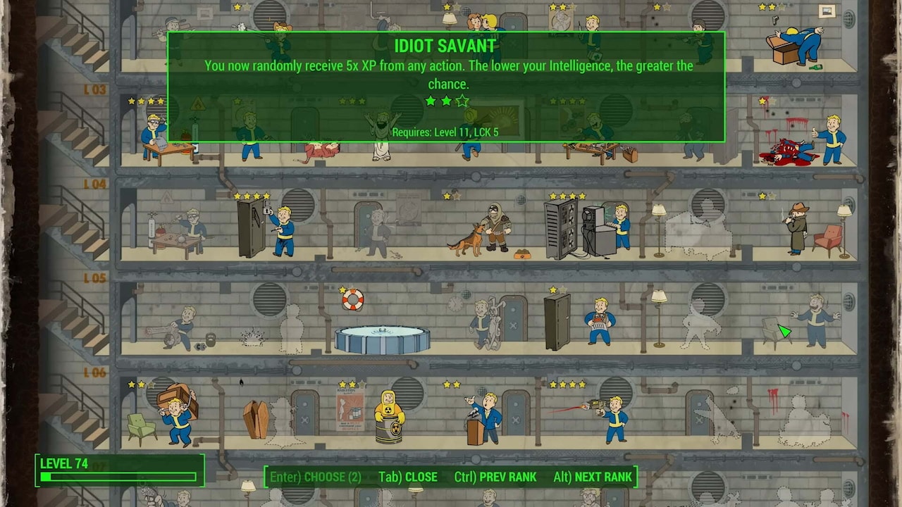 Here’s the thing: Idiot Savant can trigger even when you receive experience for finishing a quest. As such, you can save the game before finishing a mission and keep reloading it until the perk triggers, resulting in massive experience gains. That’s why having low INT may be preferable; at 1 INT there’s an 11% chance for activation, meaning you’d have to reload a save just 9 times on average before it triggers. With 11 INT the chance goes down to 1%.