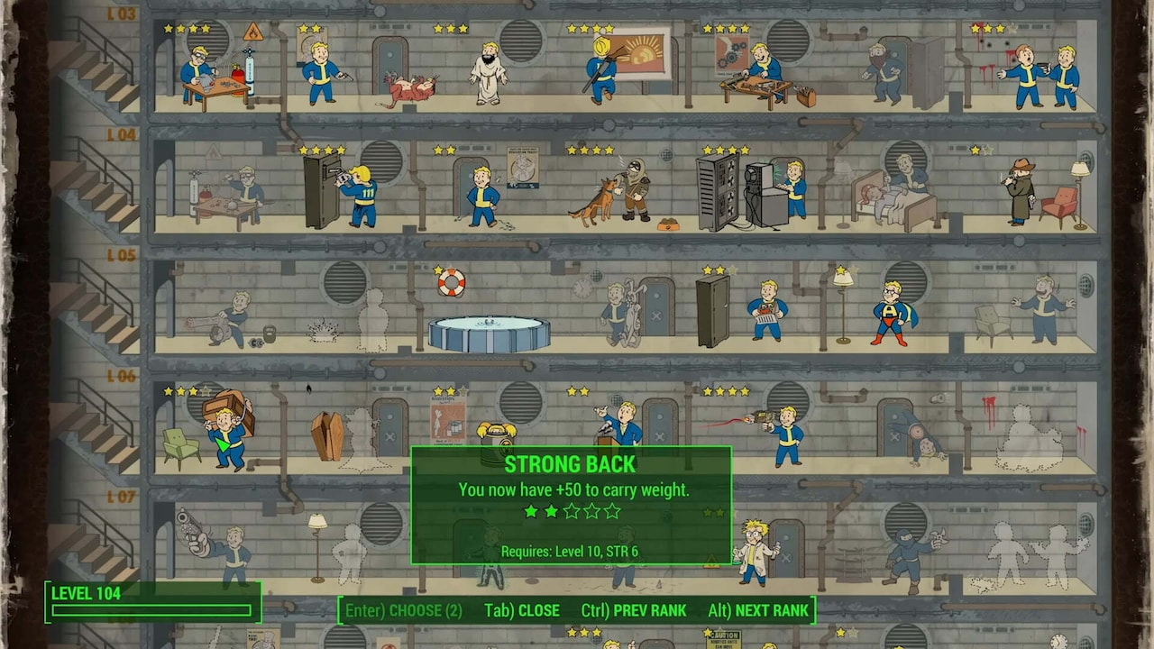 In FO4 you’ll be finding a lot of useful items you’d want to take with you to either sell or turn into crafting materials. However, items have weight and your carry capacity is limited. To make looting less cumbersome, it would be a good idea to invest in Strong Back, which will increase your carry weight by 25 at Rank 1 and 25 more at Rank 2. Rank 4 will even allow you to use fast travel while over-encumbered in Normal Mode, which is a major convenience.