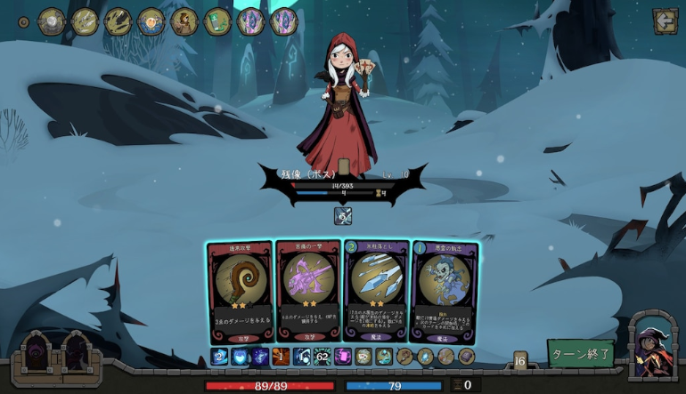 Along the way, she encounters many obstacles and different characters, including ghosts and witches, and in the course of her adventures, the player collects cards to build his own unique deck.