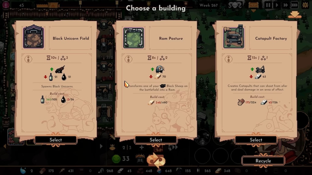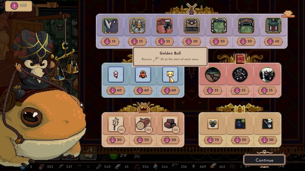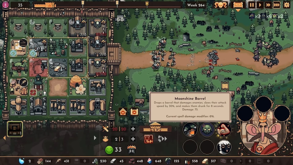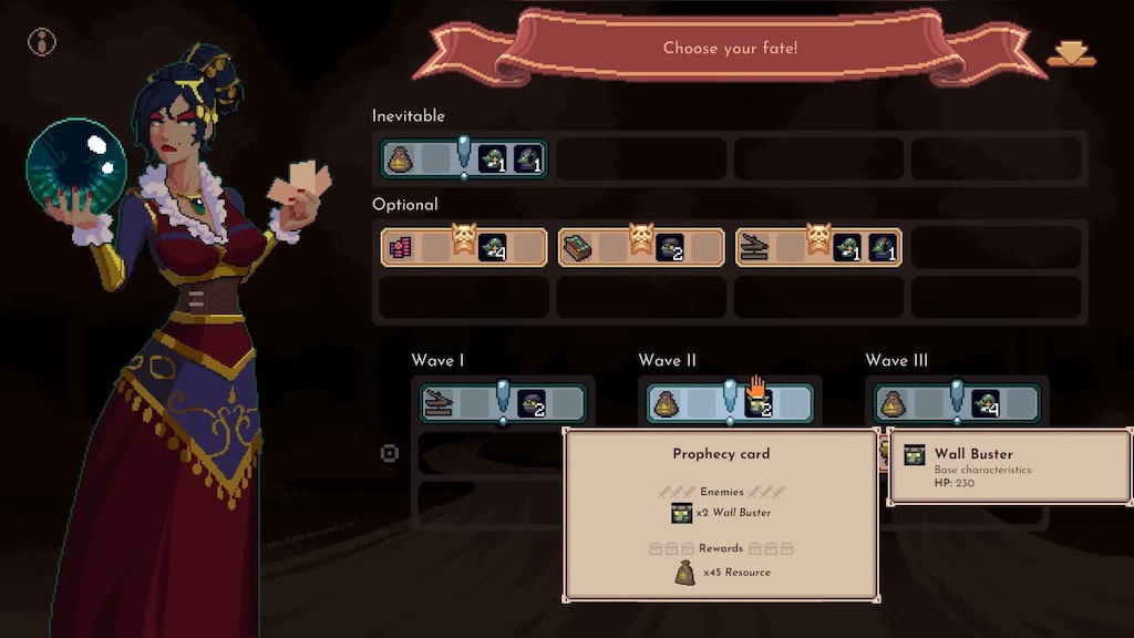 Enemy waves come with selectable modifiers and rewards, so you choose how hard you want to make it and what kind of payout you’re aiming for. Every few waves, a trader stops by, offering artifacts, upgrades, spells, and buildings.
