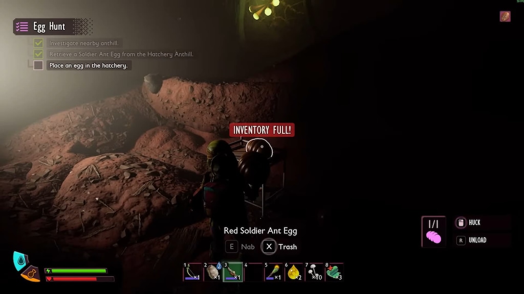 - Go down the tunnel until you discover a small metal cart filled with Red Soldier Ant Eggs – take one and make your way back, holding the egg in one of your hands to the southern entrance (it won’t fit in your inventory, so you’ll need one hand to carry it and the other to fight the remaining foes).