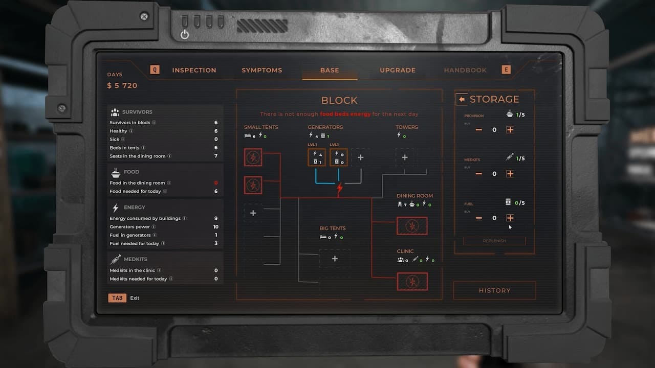 Once you’ve mastered the basics, the real challenge begins: keeping the camp “alive” through smart resource management. Food, medicine, fuel, and technical materials are extremely limited, and every new arrival increases overall consumption. At the same time, a more developed camp opens up new possibilities — advanced diagnostic tools, better infection testing methods, stronger weapons, defensive systems, and various upgrades.