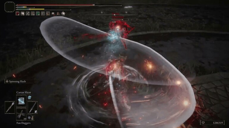 Spinning Slash has Keen Affinity and can be applied to many weapons, including Swords, Axes, and Polearms — only Colossal Weapons are excluded, making it useful for many builds. Its cost varies depending on the weapon, ranging from 6-12 FP. It cannot be parried or charged, and it delivers an impressive 33 stance damage!