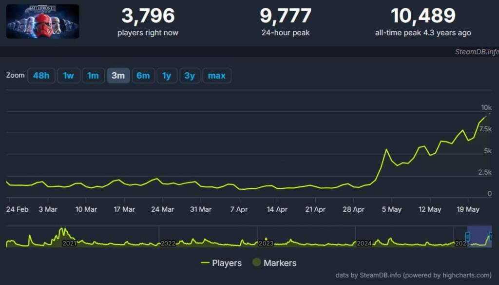 The data indicates that player numbers have exploded since the end of the Andor TV show on Disney. Although the game launched in 2017 and already experienced the highest number of concurrent players in January 2021, it’s rising to peak popularity again in May 2025.