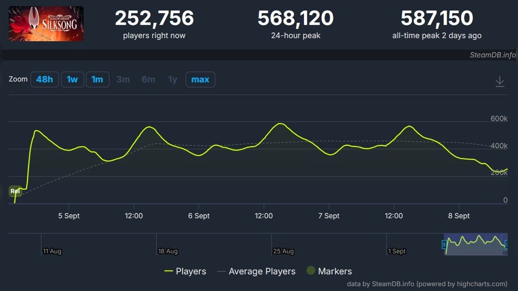 Once the dust settled and storefronts recovered, things picked up fast. Silksong didn’t just sell well, it dominated. Just a few hours after launch, Steam recorded 453,993 concurrent players. That made it the third most played game on the platform, right behind Counter Strike 2 and Dota 2. For comparison, it’s already passed games like HELLDIVERS 2 and Stardew Valley. And it’s still climbing.