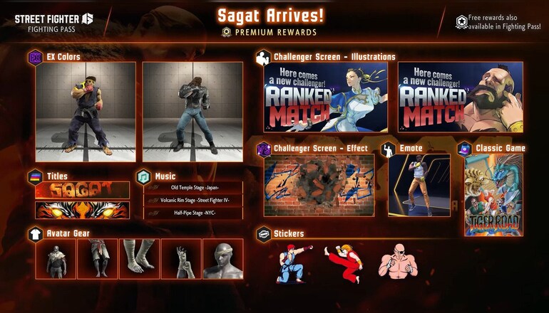 With Sagat’s exciting comeback in Street Fighter 6 Season 3, a brand-new Fighting Pass is ready to explore! This pass is full of great rewards, including special EX Colors that give your fighters a cool and fresh look. You’ll also fight on Sagat’s amazing Thailand-themed stage, inspired by his roots and full of energy and detail.