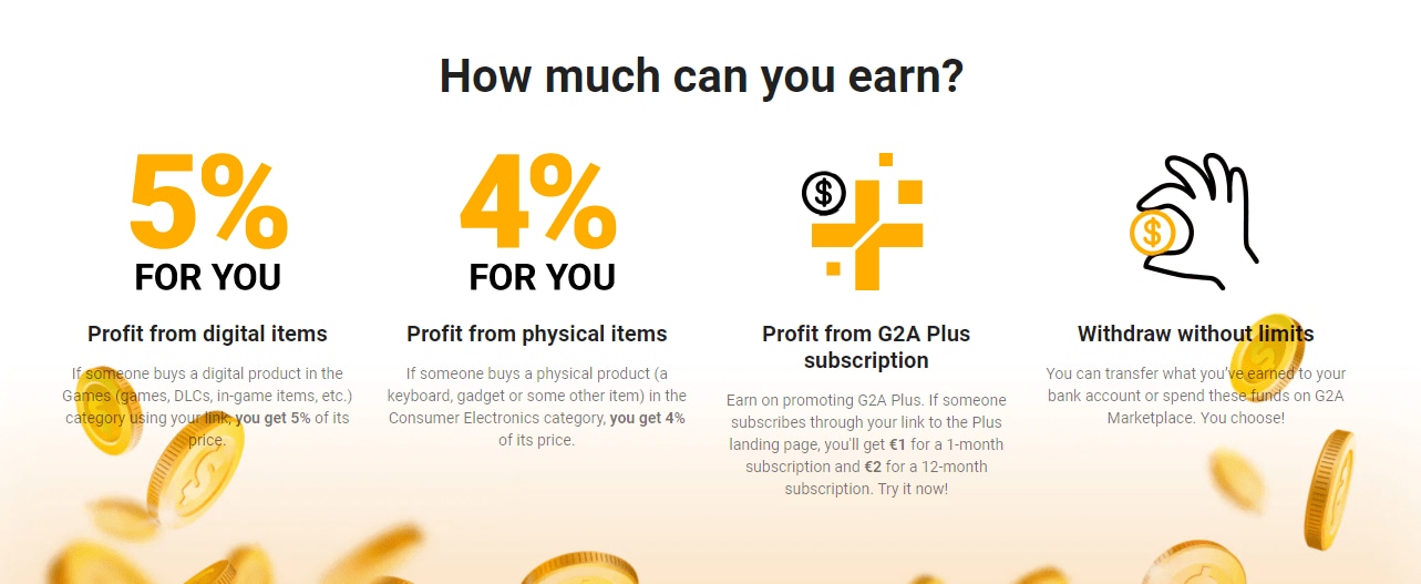 G2A Goldmine is, in the simplest terms, a referral program which allows you to create a unique reflink you can then send to your audience or friends. Every purchase they make through your link gives you a small share of the money they spend, 5% for digital products and 4% for physical ones. There are also special events, which increase your share under special conditions.